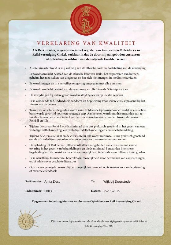 Je hebt er geen vooropleiding voor nodig en iedereen kan het leren. Na de intensieve cursus Reiki 1 kan je direct Reiki toepassen op jezelf en je naasten. Wil je je kennis en vaardigheden verder uitbreiden, anderen gaan behandelen en Reiki op een snellere manier toepassen, dan is de cursus Reiki 2 iets voor jou. Heb je alles in je leven geïntegreerd en ben je toe aan het werken op zielsniveau, dan kan je dat leren in de cursus Reiki 3a. Door deze stappen in je eigen tempo te doorlopen, wordt Reiki een pad naar je Ware Zelf. Je 'doet' dan geen Reiki meer, maar je bént Reiki.